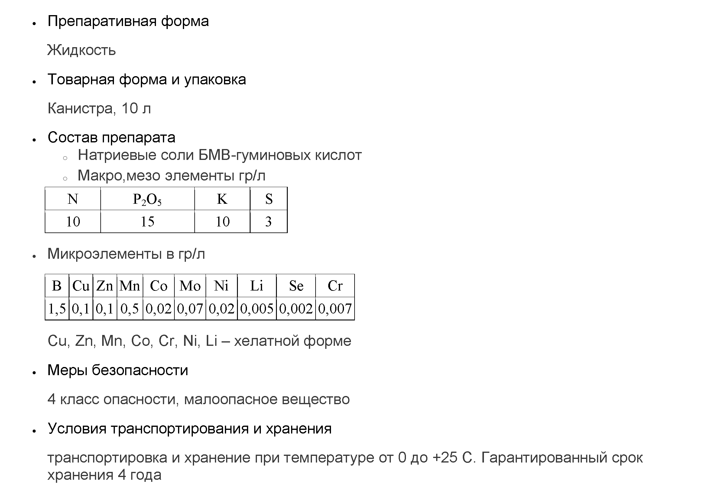 Комплексное питание всех с\х культур в виде корневых и некорневых подкормок, обработка семян перед посевом. Изготовленные из биоактивированных по молекулярному весу калийных солей гуминовых кислот, находящихся в свободной мобильной форме, которые проникают в растения за счет повышения проницаемости клеточной мембраны и активно включаются в обменные процессы сельскохозяйственных растений, что способствует: