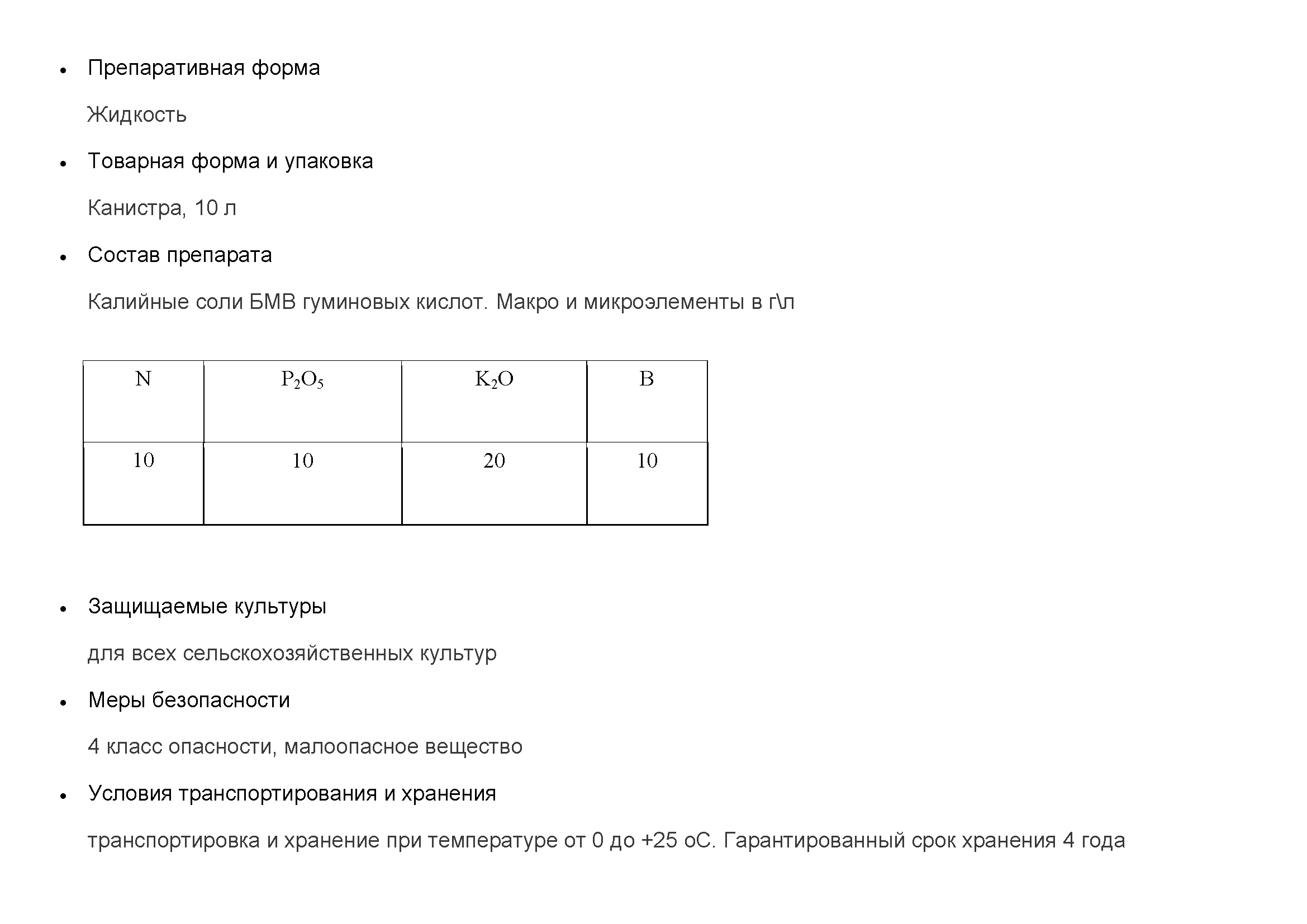 Комплексное питание всех с\х культур в виде корневых и некорневых подкормок, обработка семян перед посевом. Изготовленные из биоактивированных по молекулярному весу калийных солей гуминовых кислот, находящихся в свободной мобильной форме, которые проникают в растения за счет повышения проницаемости клеточной мембраны и активно включаются в обменные процессы сельскохозяйственных растений, что способствует: