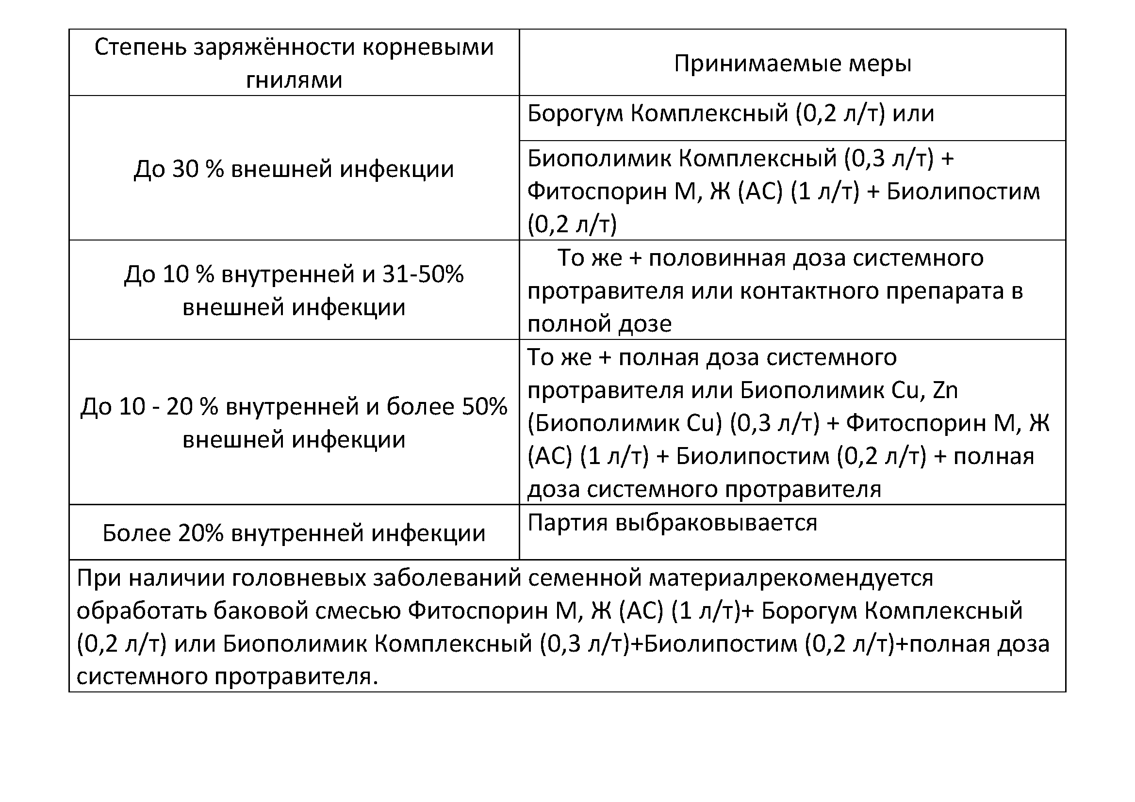 Таблица 1. Примерный выбор технологии протравливания в зависимости от заражённости сельскохозяйственных культур