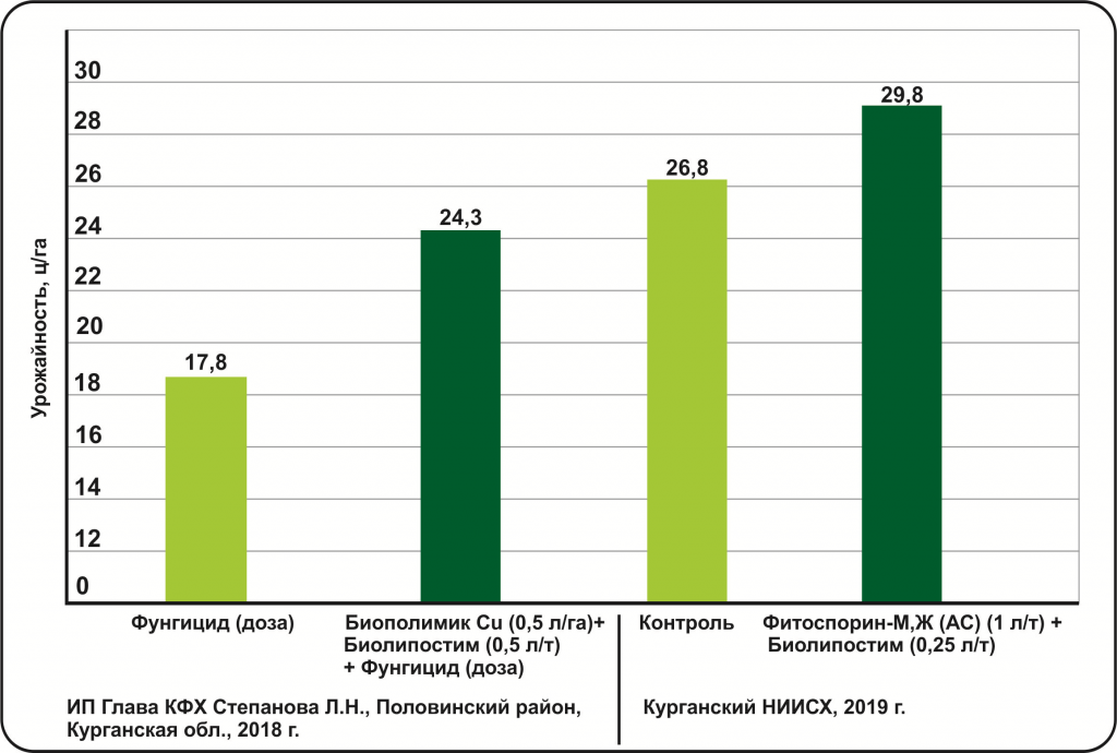 применение биофунгицида в рекомендованной дозе способствовало улучшению сохранности растений к концу вегетации. Количество зерен в колосе и масса зерна были существенно выше, чем на аналогичных контрольных образцах;