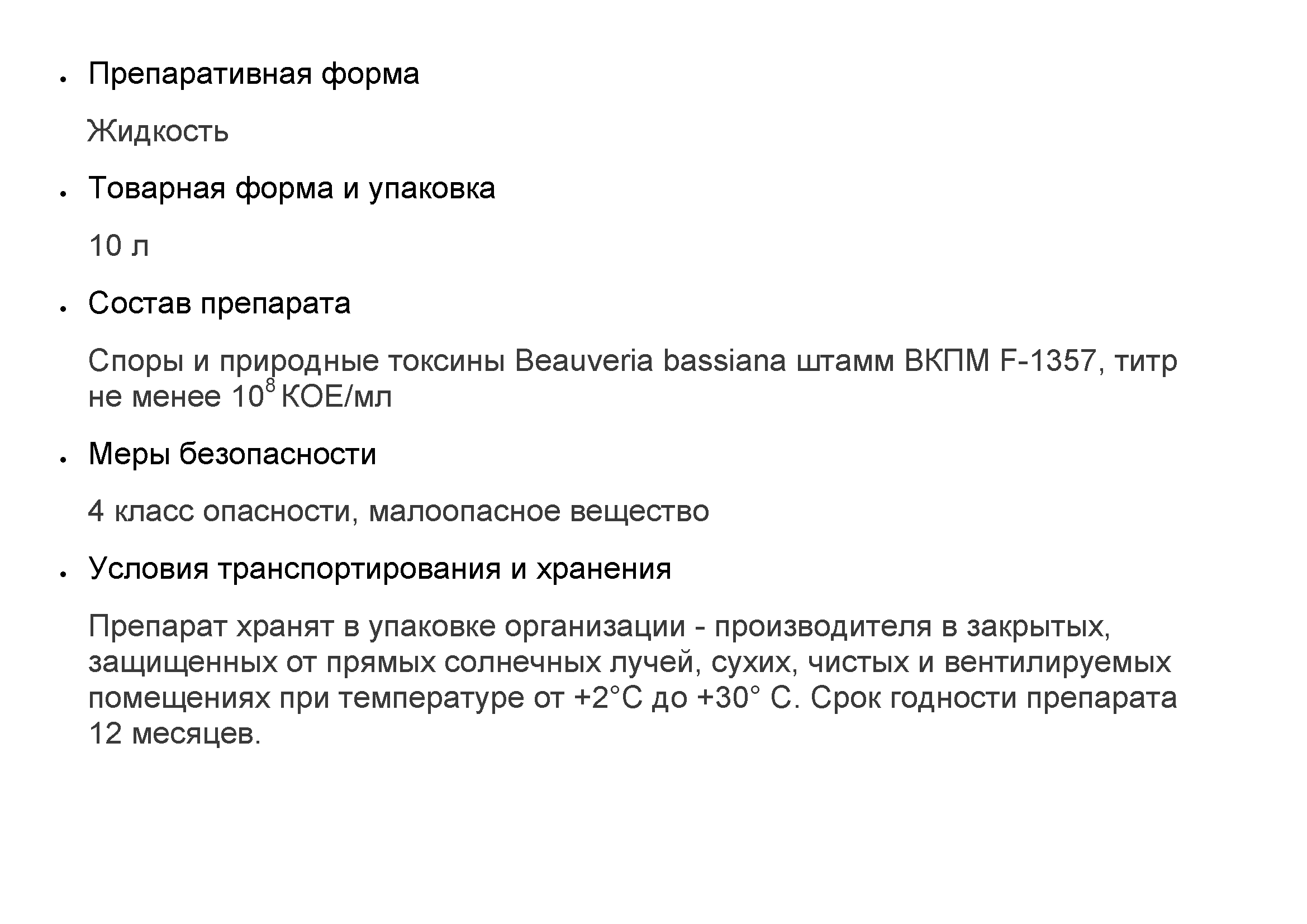 Назначение: Биологический инсектицид контактного действия для борьбы с личинками насекомых отряда чешуекрылых, равнокрылых и трипсов на основе энтомопатогенного гриба Beauveria bassiana. Преимущества: