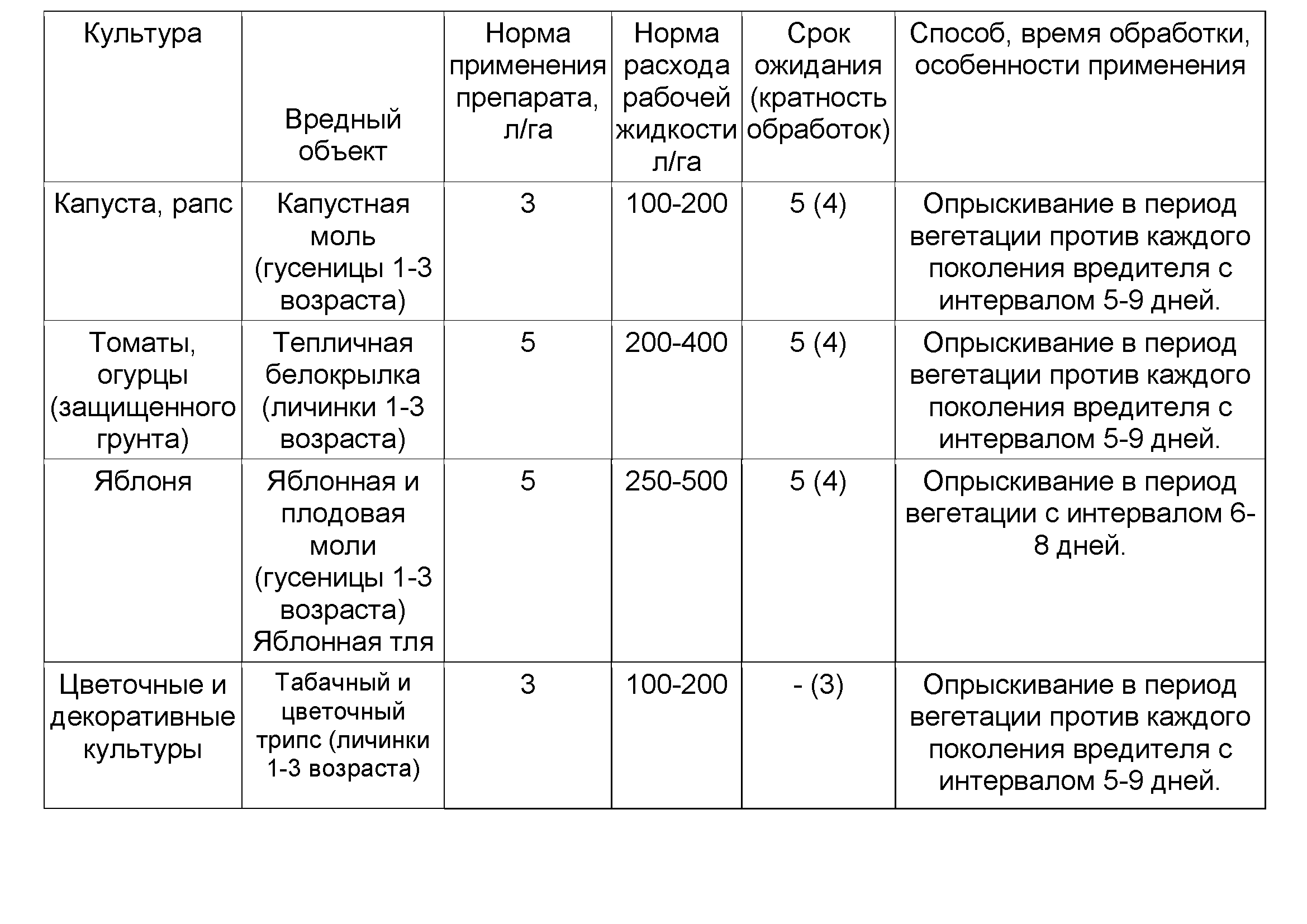 Спектр действия: препарат эффективен против личинок младших возрастов капустной моли, яблонной и плодовой моли, табачного и цветочного трипса, тепличной белокрылки, яблонной тли.