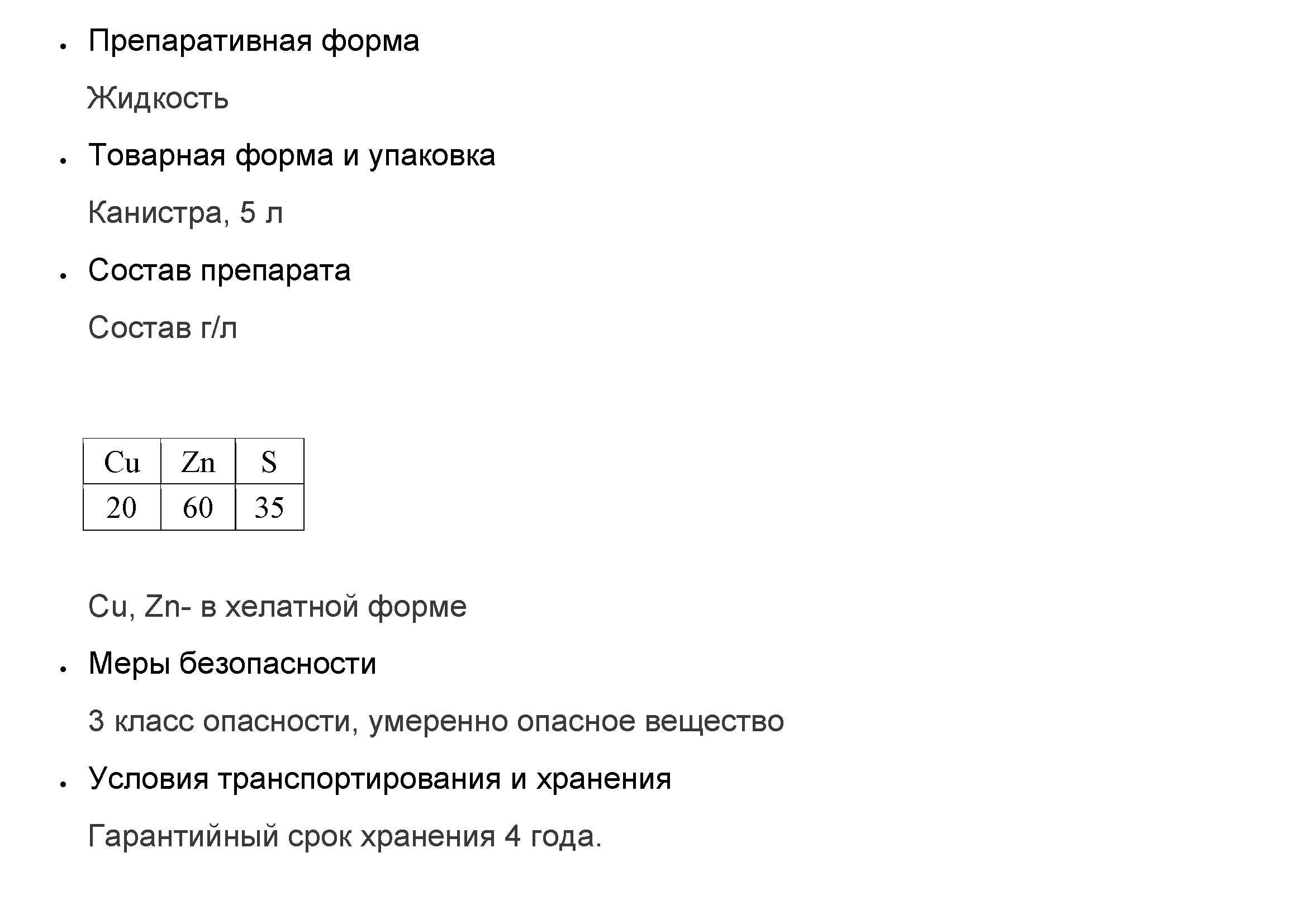 - Cбалансированная легкодоступная форма меди и цинка в виде хелата (EDTA), легко проникающего через листовую поверхность, обеспечивает максимальное усвоение, предотвращая окисление элементов;