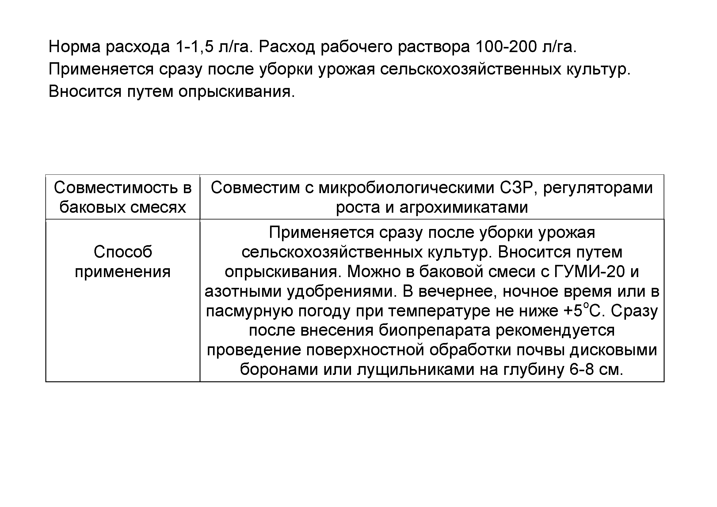 Назначение: Многофункциональный препарат, предназначенный для оздоровления почвы; ускорения разложения и обеззараживания растительных остатков с/х культур; улучшение пищевого режима почвы; нейтрализации остатков химических пестицидов. Преимущества: Совместим с микробиологическими средствами защиты растений, регуляторами роста и агрохимикатами. Действие препарата усиливается при внесении в рабочий раствор ГУМИ-20 в дозе 1 л / га и азотных удобрений