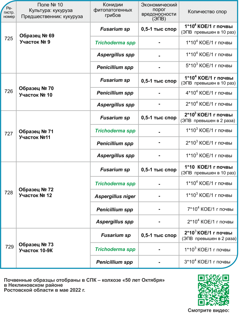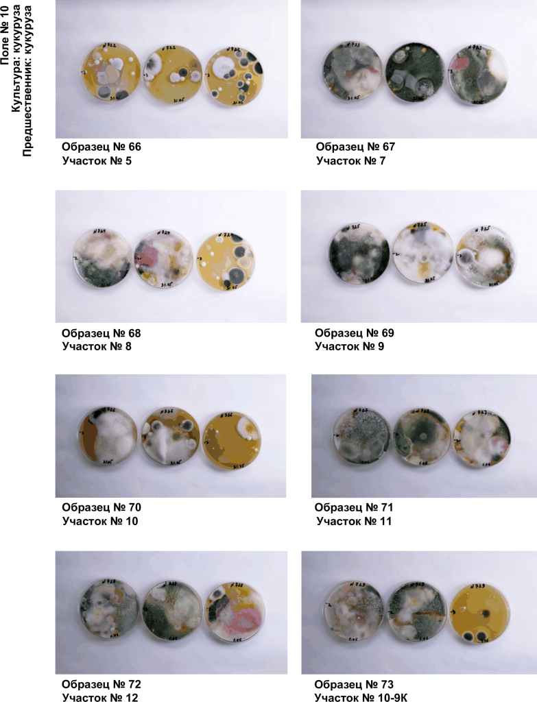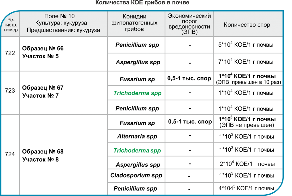 Насыщение севооборотов зерновыми культурами и широкое применение агрохимикатов вызывает формирование пула природных микроорганизмов, многие из которых являются патогенами растений. Размножаясь и зимуя на остатках отмерших растений предыдущего года, они инфицируют растения следующего вегетационного сезона. Также обостряются алелопатические проявления, в почве накапливаются остатки пестицидов и других ксенобиотиков. И именно эти последствия нарушения равновесия в экосистеме важно нивелировать. Попытка применять химические средства в этой ситуации лишь усугубляет дисбаланс. Специалисты НВП «БашИнком» провели ряд лабораторных и полевых опытов и пришли к выводу, что реальным и эффективным способом запуска восстановительных процессов в почве является видовое расширения микробного ценоза. Это возможно благодаря внесению агрономически полезной микробиоты, живые клетки которой входят в состав биологических препаратов, в частности деструкторов. В результате проведения анализа методом посева разведенной водной суспензии почвы на питательную среду КГА (картофельно-глюкозный агар) в 1 г абсолютно-сухой почвы обнаружено наличие грибов (см. таблицу). Из почвенных образцов Ростовской области была выделена чистая культура гриба Trichoderma spp и отправлена на генетическую идентификацию в ВКПМ (г. Москва). Из Саратовской области, где также использовался препарат Стерня-12, были получены образцы почвы и корней растений пшеницы, из которых также были выделены образцы гриба рода Trichoderma spp и впоследствии были отправлены на идентификацию. Анализ образцов культуры Триходермы, полученных из почвы Ростовской и Саратовской областей, после применения препарата Стерня-12 по разложению пожнивных остатков показал идентичность видового состава культур Триходермы. В обоих случаях выделенная Триходерма относилась к виду Trichoderma harzianum, который входит в препарат Стерня-12 в составе комплекса из 4 видов грибов Триходермы.
