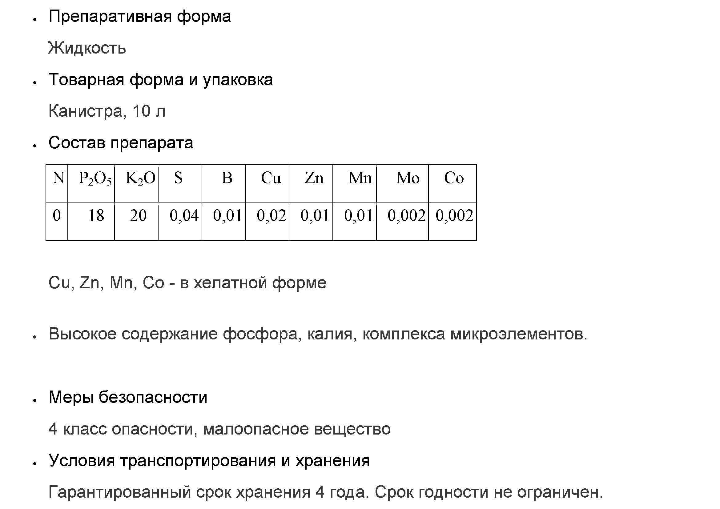 Назначение: Комплексное макро-, мезо- и микропитание для внекорневой подкормки всех сельскохозяйственных культур. Улучшает процесс закладки генеративных органов. Усиливает углеводный обмен, синтез сахаров. Повышает урожай и качество продукции