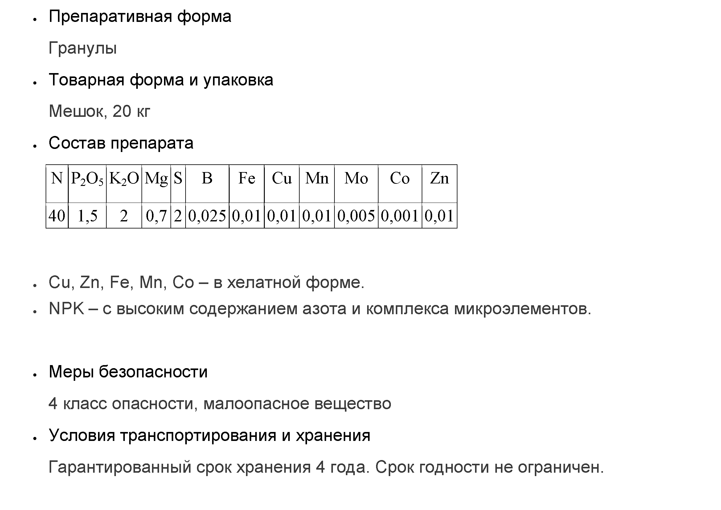 • содержит сбалансированный набор микроэлементов в хелатной форме, легко проникающих через клеточную мембрану, что обеспечивает полное усвоение, предотвращая окисление элементов;