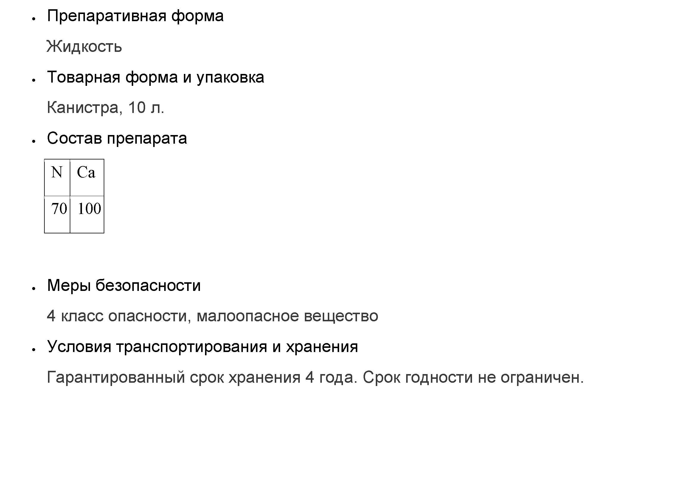 оптимальная высококонцентрированная легкодоступная форма азота и кальция; сбалансированный набор микроэлементов в хелатной форме, легко проникающих через клеточную мембрану, что обеспечивает полное усвоение, предотвращая окисление элементов;