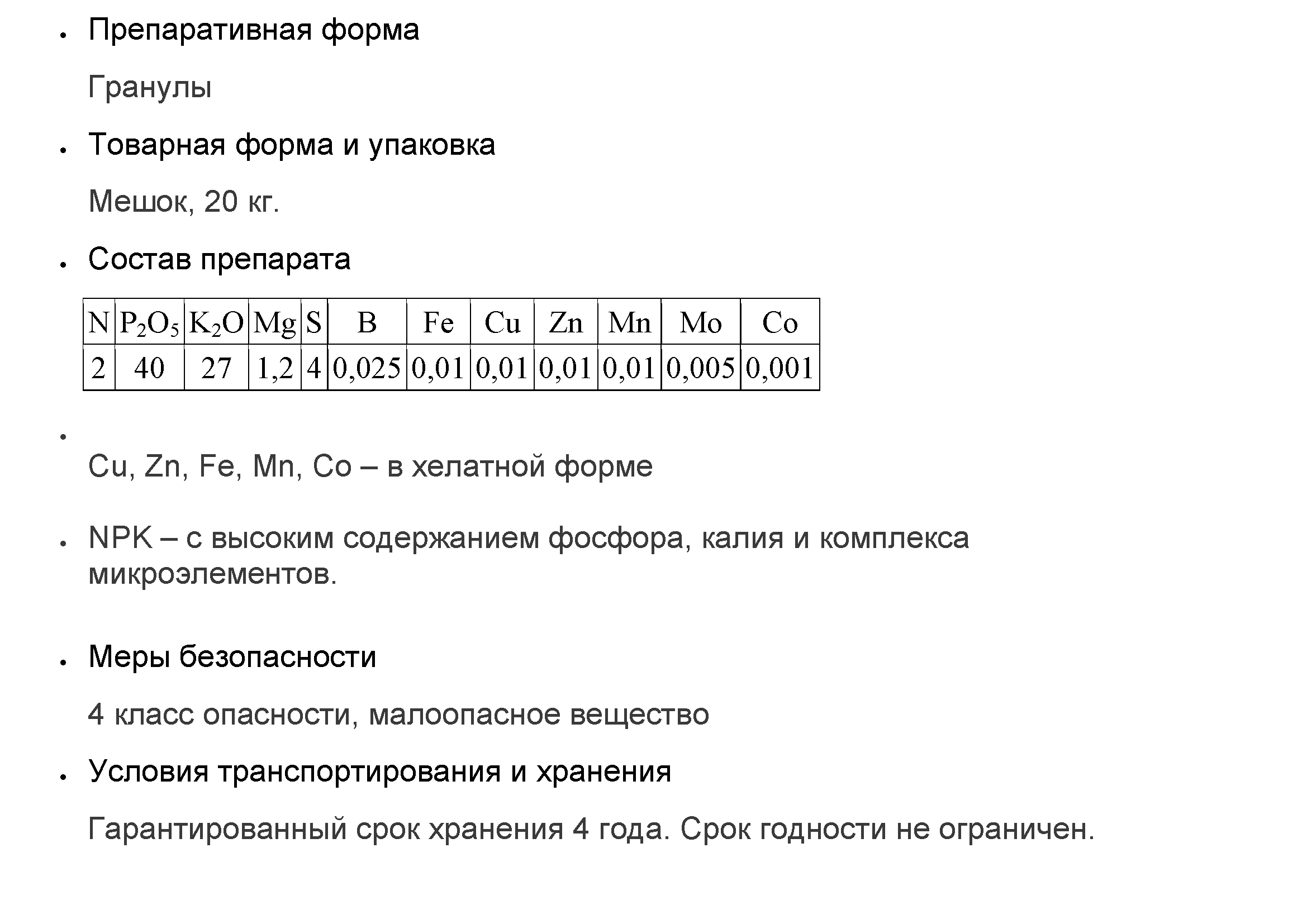 - не содержит вредных и балластных веществ; повышает урожайность и качество сельскохозяйственных культур.